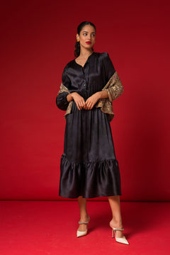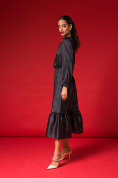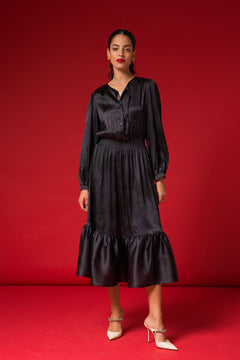 Meet the Juliette Dress, one of our best sellers. The midi-length ruffled skirt and full sweep is shaped at the waist with an easy smocking. No collar here! The button front can be closed with ties or left open for a casual look. This dress looks great with boots, heels, and flats. It's a great alternative for the office but also checks all the boxes for a perfect party dress.